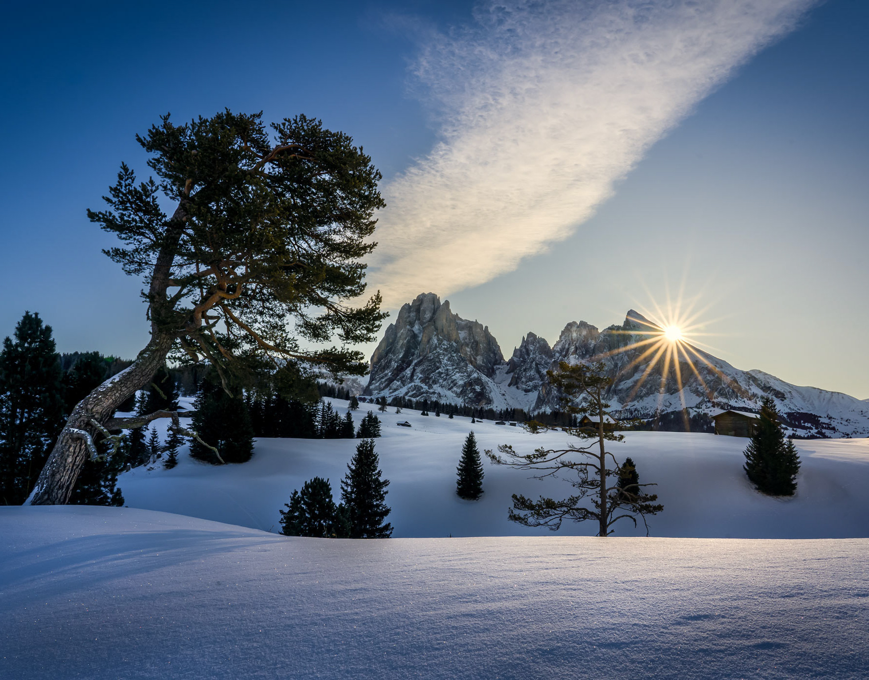 A breathtaking winter morning at Alpe di Siusi, where the rising sun paints the snowy landscape with golden hues, unveiling nature's serene beauty.