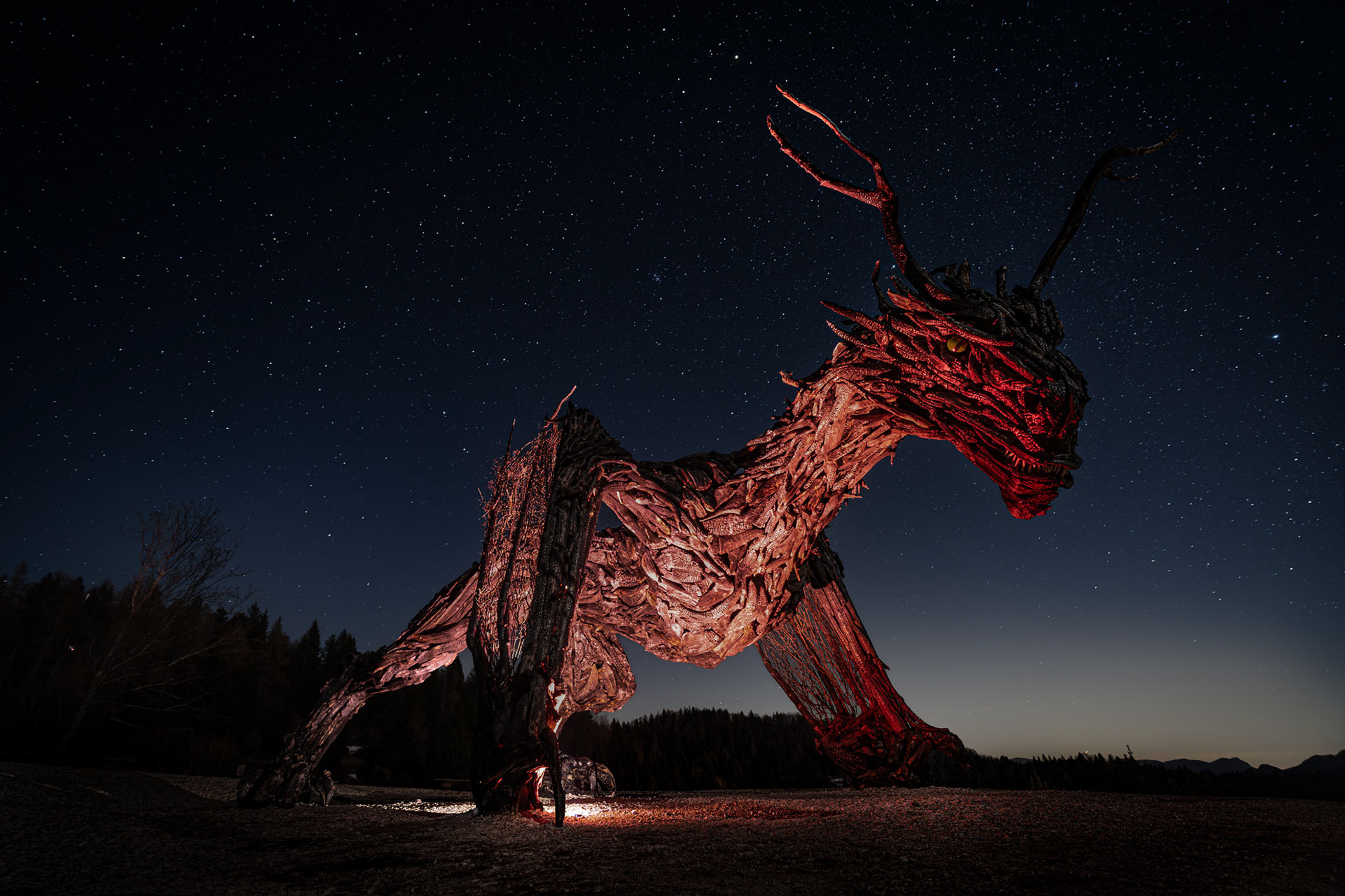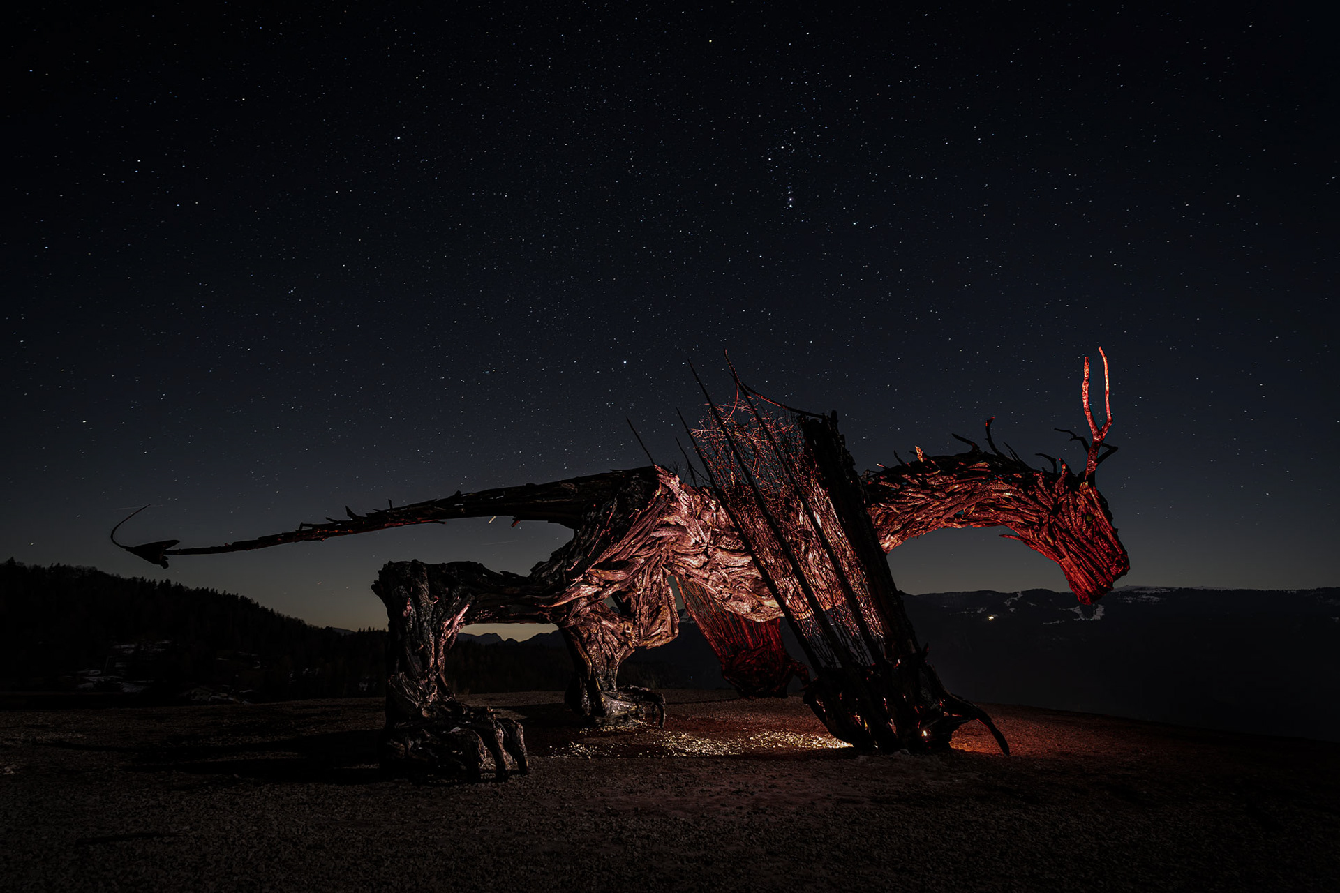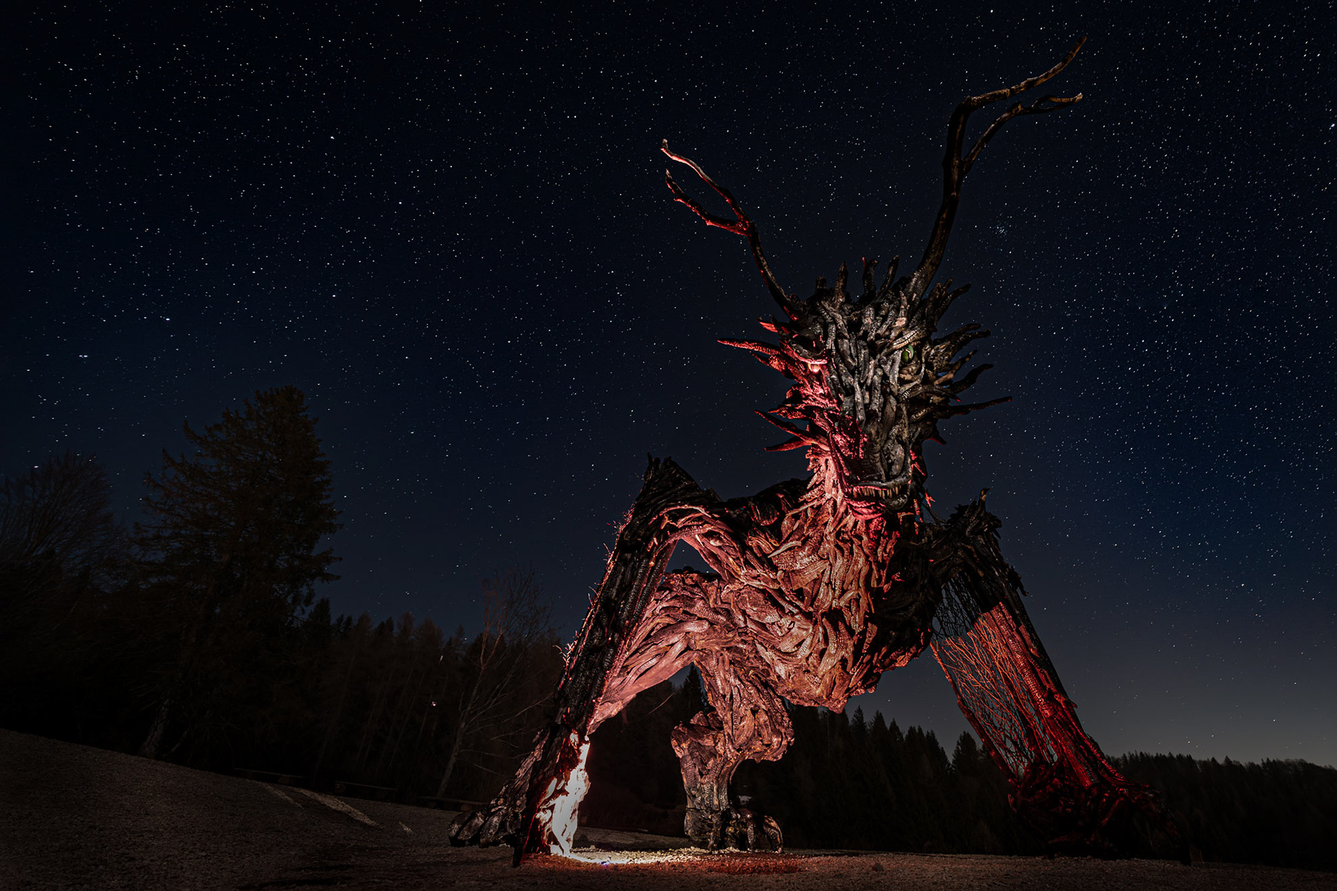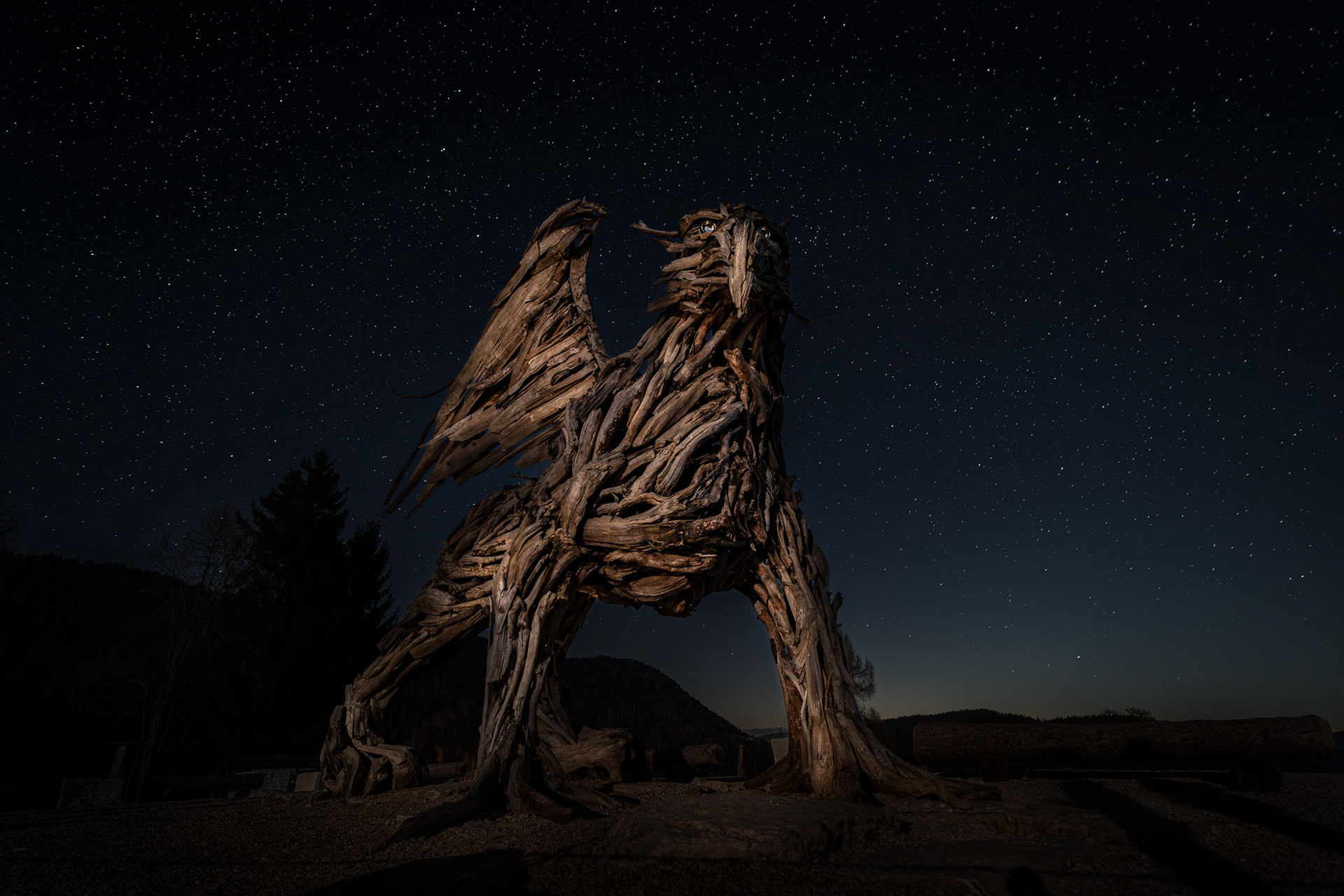 Photographing these sculptures under the starlit Trentino skies reveals a profound interplay between art and nature. In the stillness of the night, the Vaia Dragon and Gryphon take on an ethereal presence, their forms silhouetted against the celestial canvas. The charred textures of the dragon and the intricate assembly of the gryphon are accentuated by the soft glow of moonlight, creating a hauntingly beautiful scene. These nocturnal images invite viewers to reflect on the resilience embedded in these artworks and the landscapes they inhabit, offering a serene yet powerful narrative of rebirth and unity.