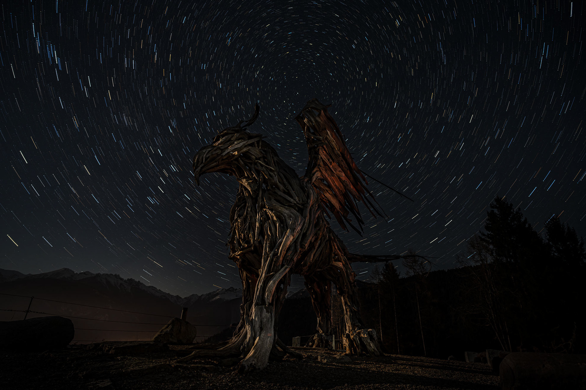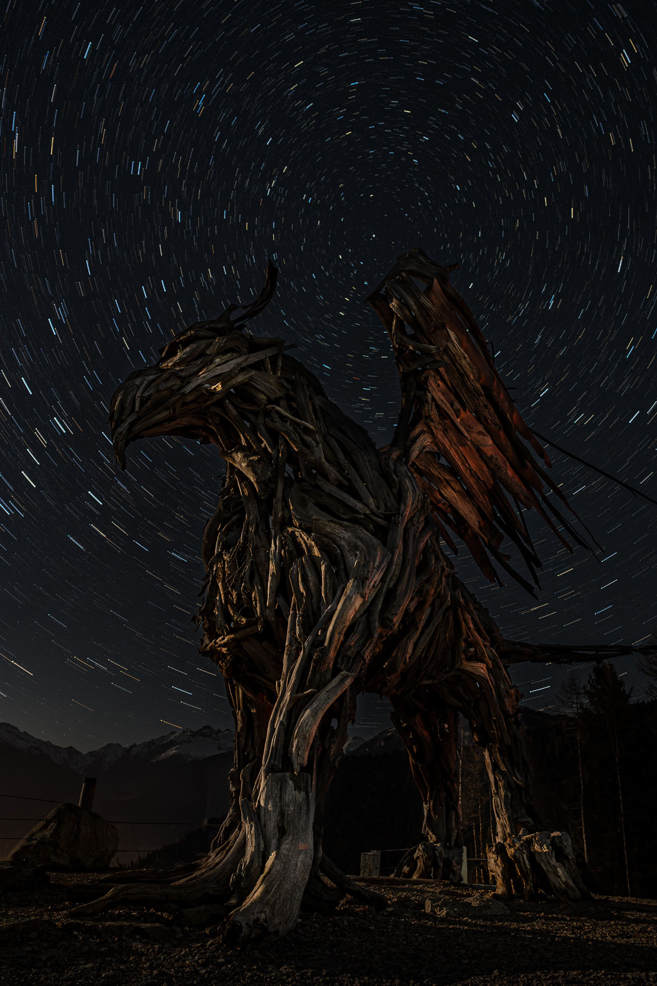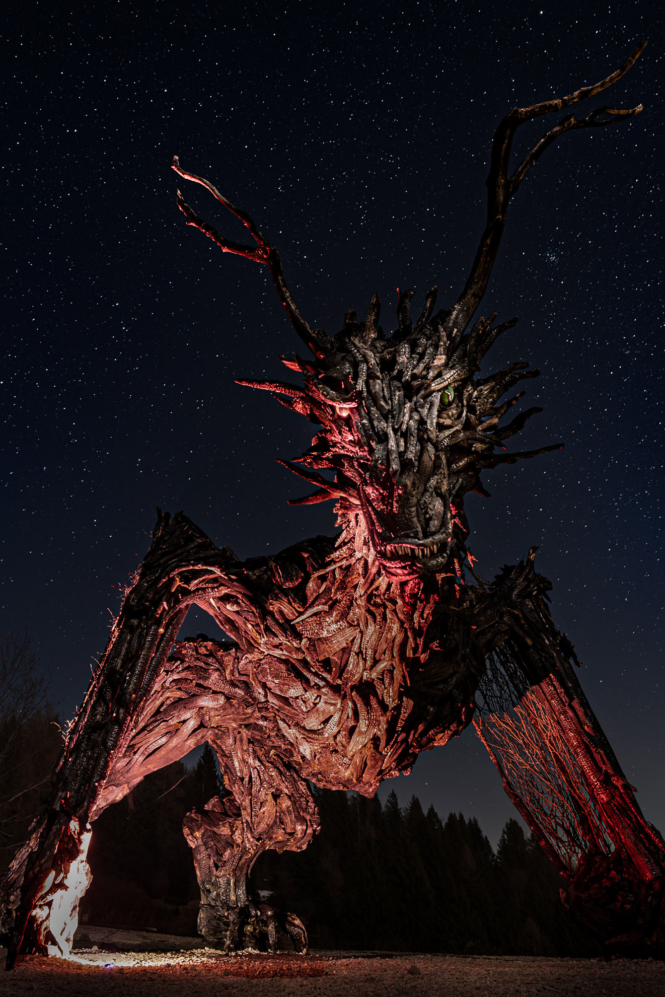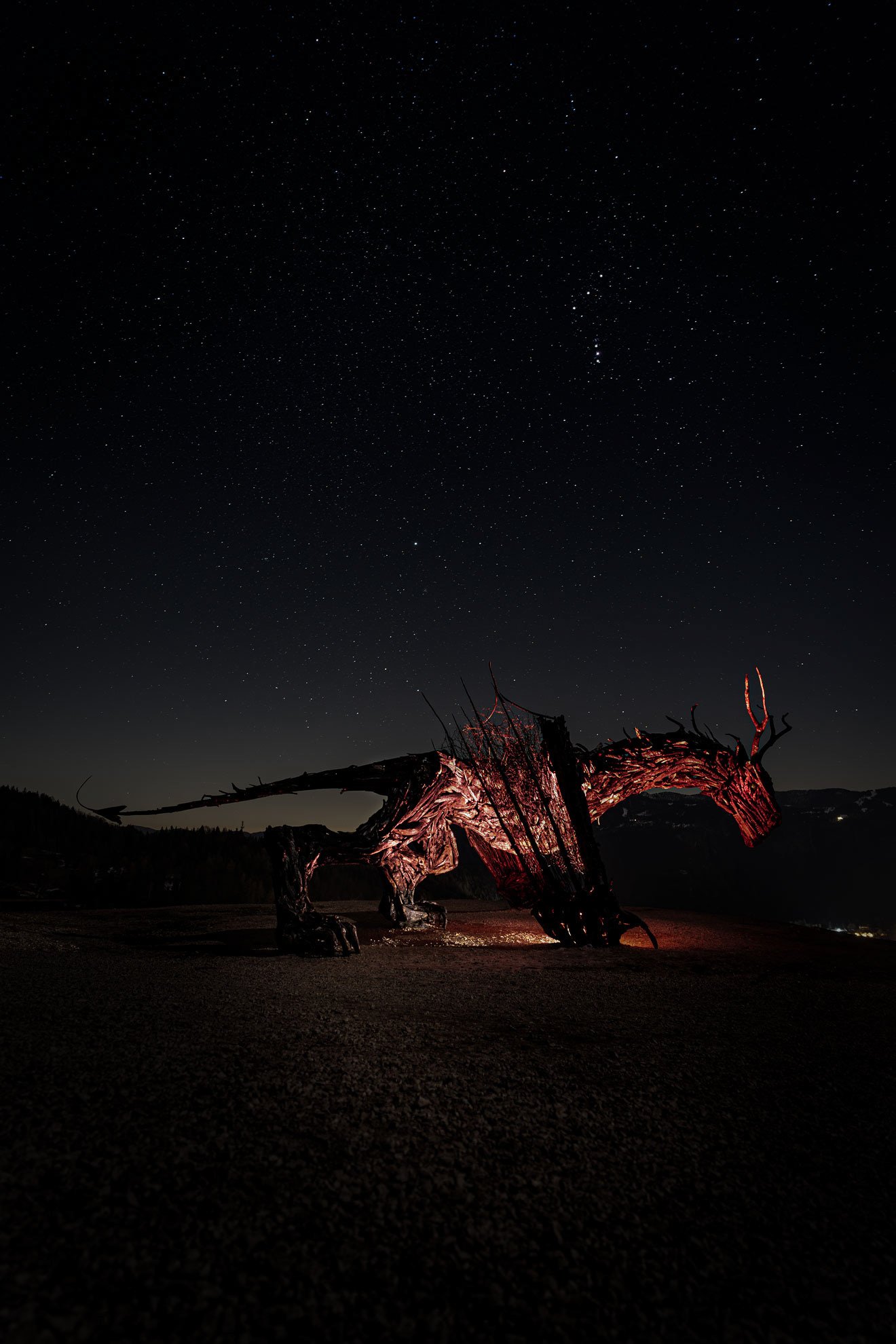 Photographing these sculptures under the starlit Trentino skies reveals a profound interplay between art and nature. In the stillness of the night, the Vaia Dragon and Gryphon take on an ethereal presence, their forms silhouetted against the celestial canvas. The charred textures of the dragon and the intricate assembly of the gryphon are accentuated by the soft glow of moonlight, creating a hauntingly beautiful scene. These nocturnal images invite viewers to reflect on the resilience embedded in these artworks and the landscapes they inhabit, offering a serene yet powerful narrative of rebirth and unity.