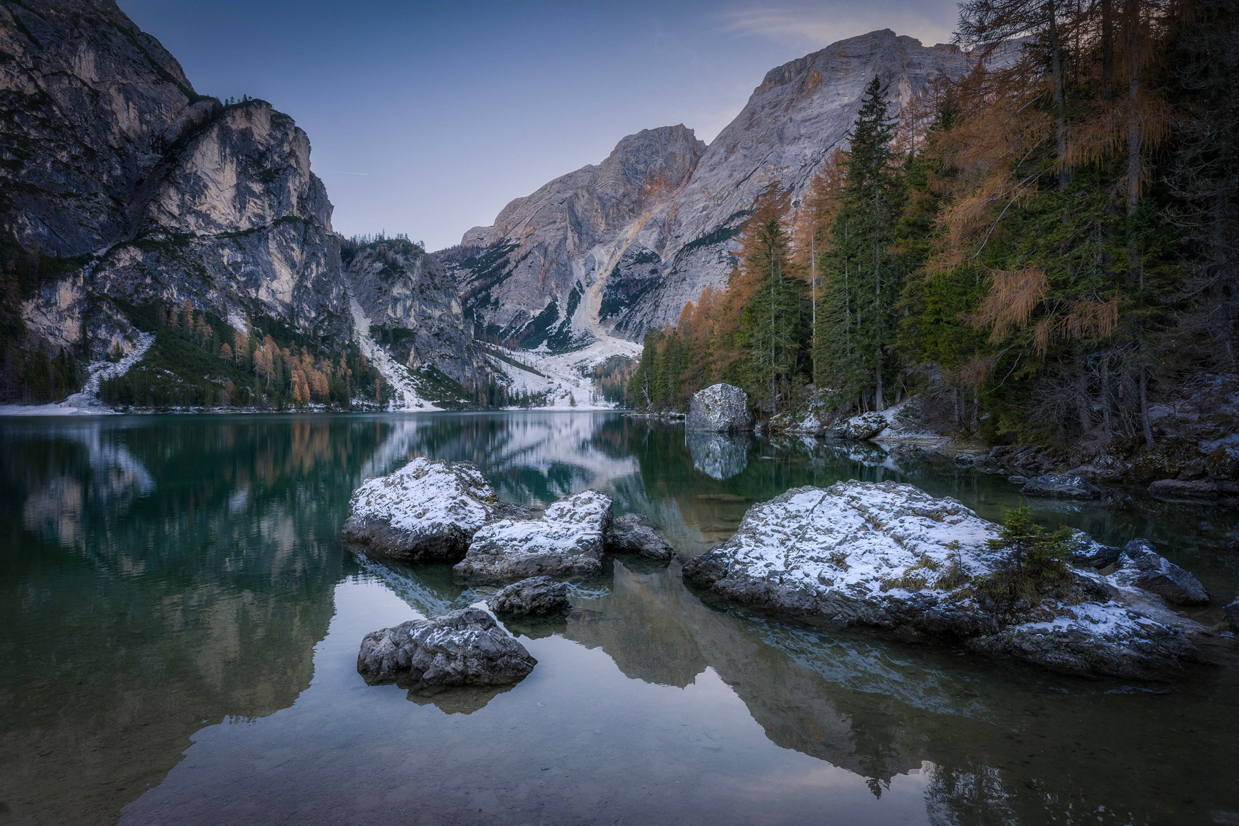 First snow in autumn on Braies Lake - Southtyrol