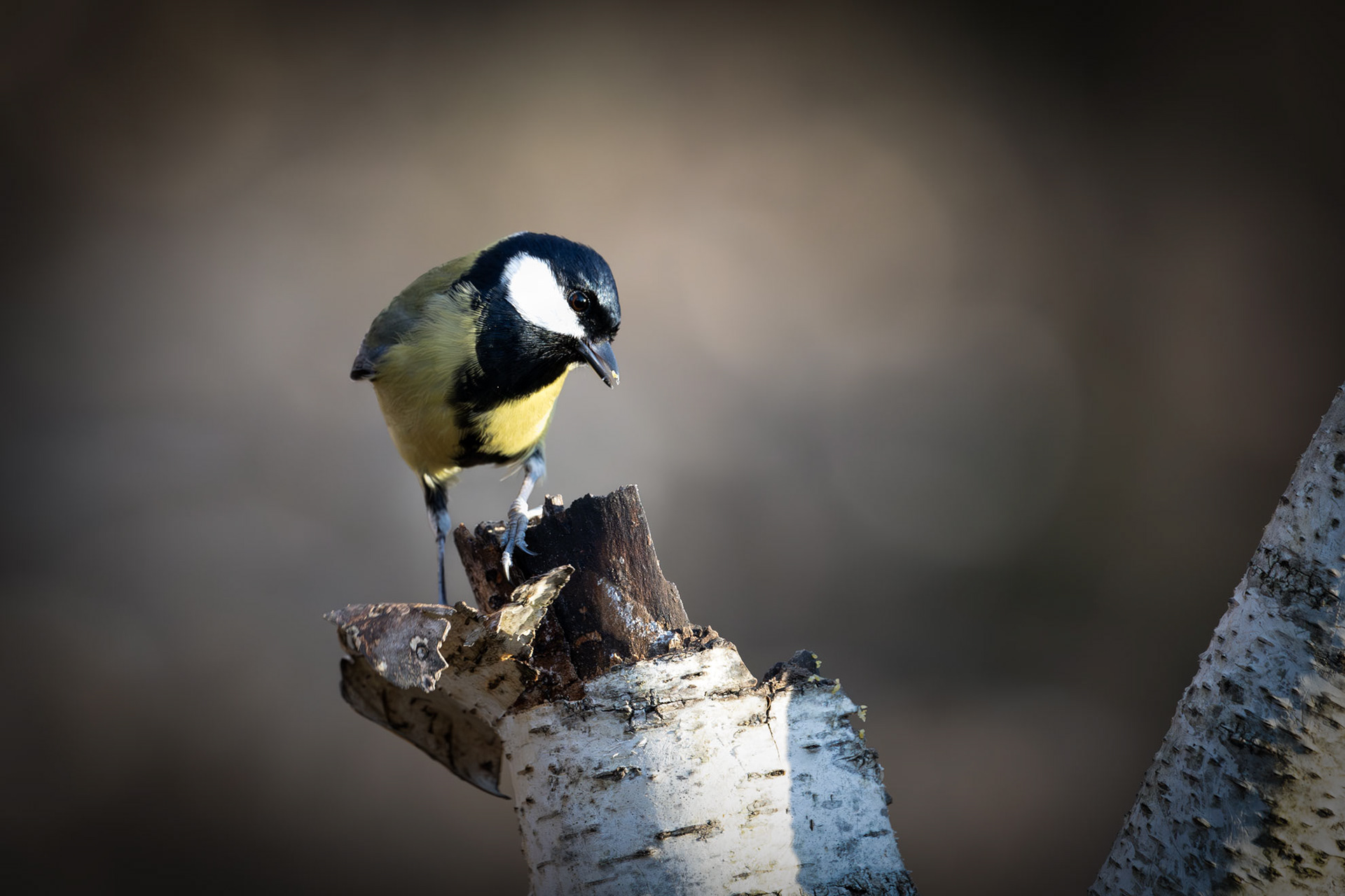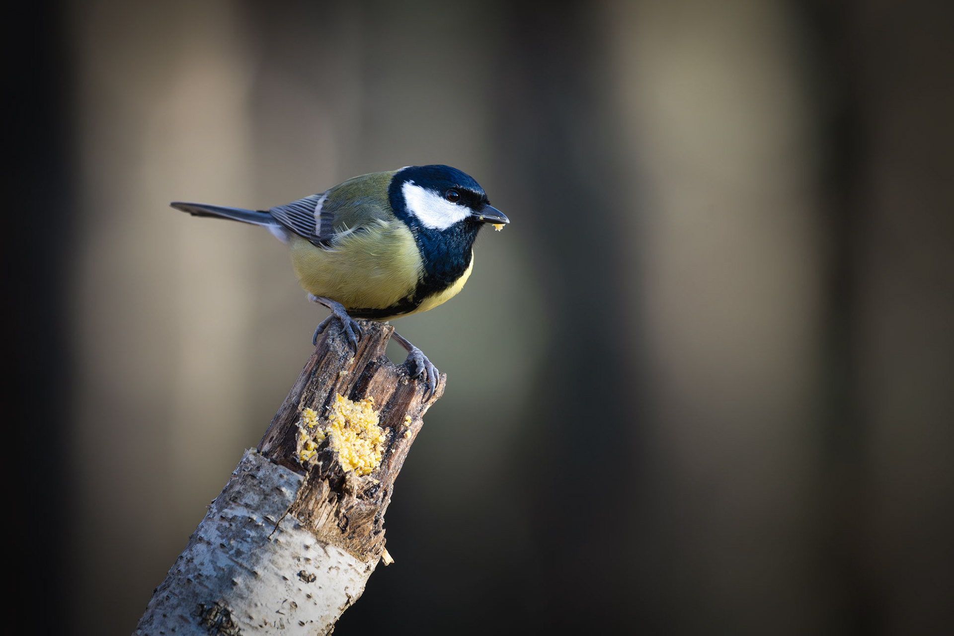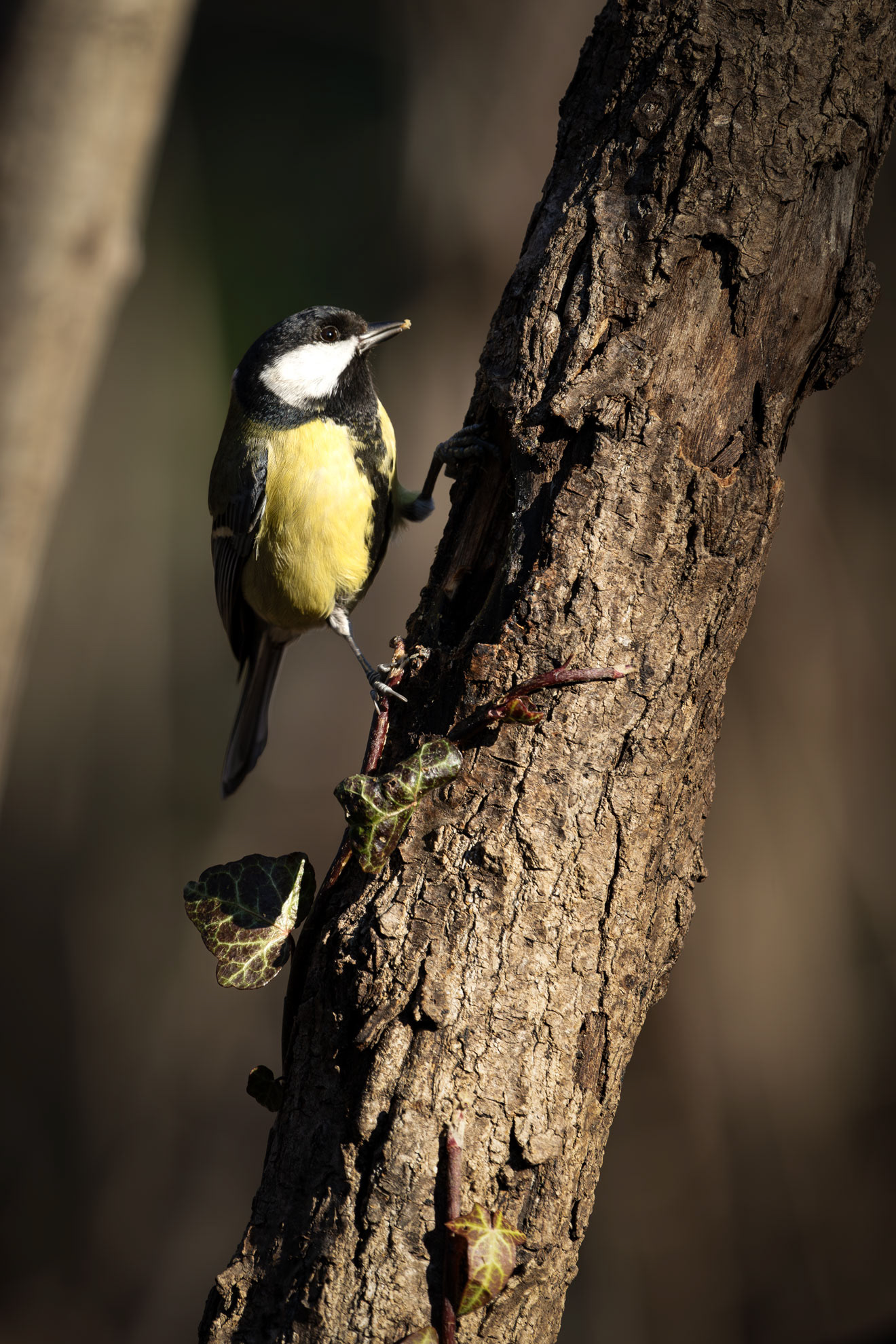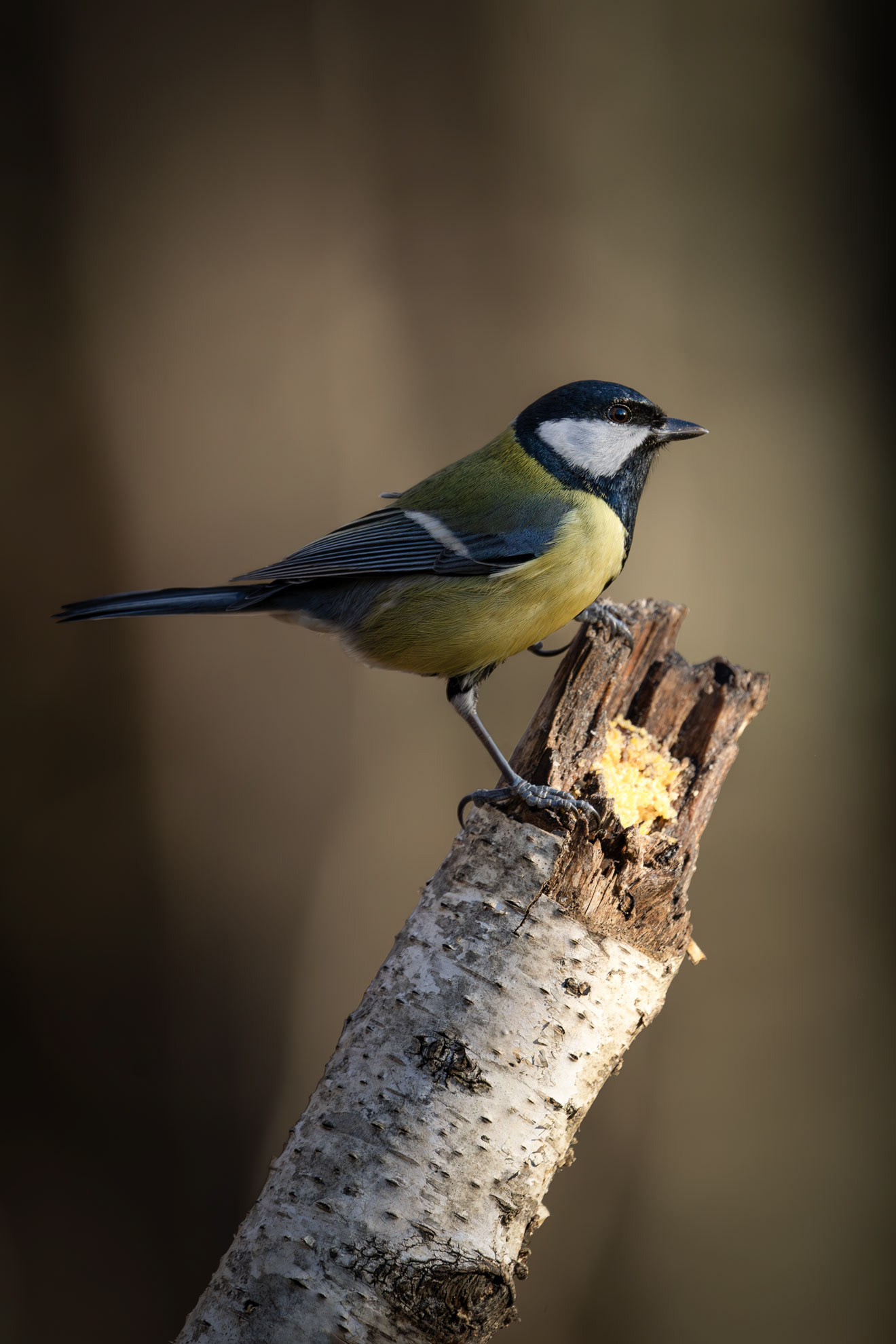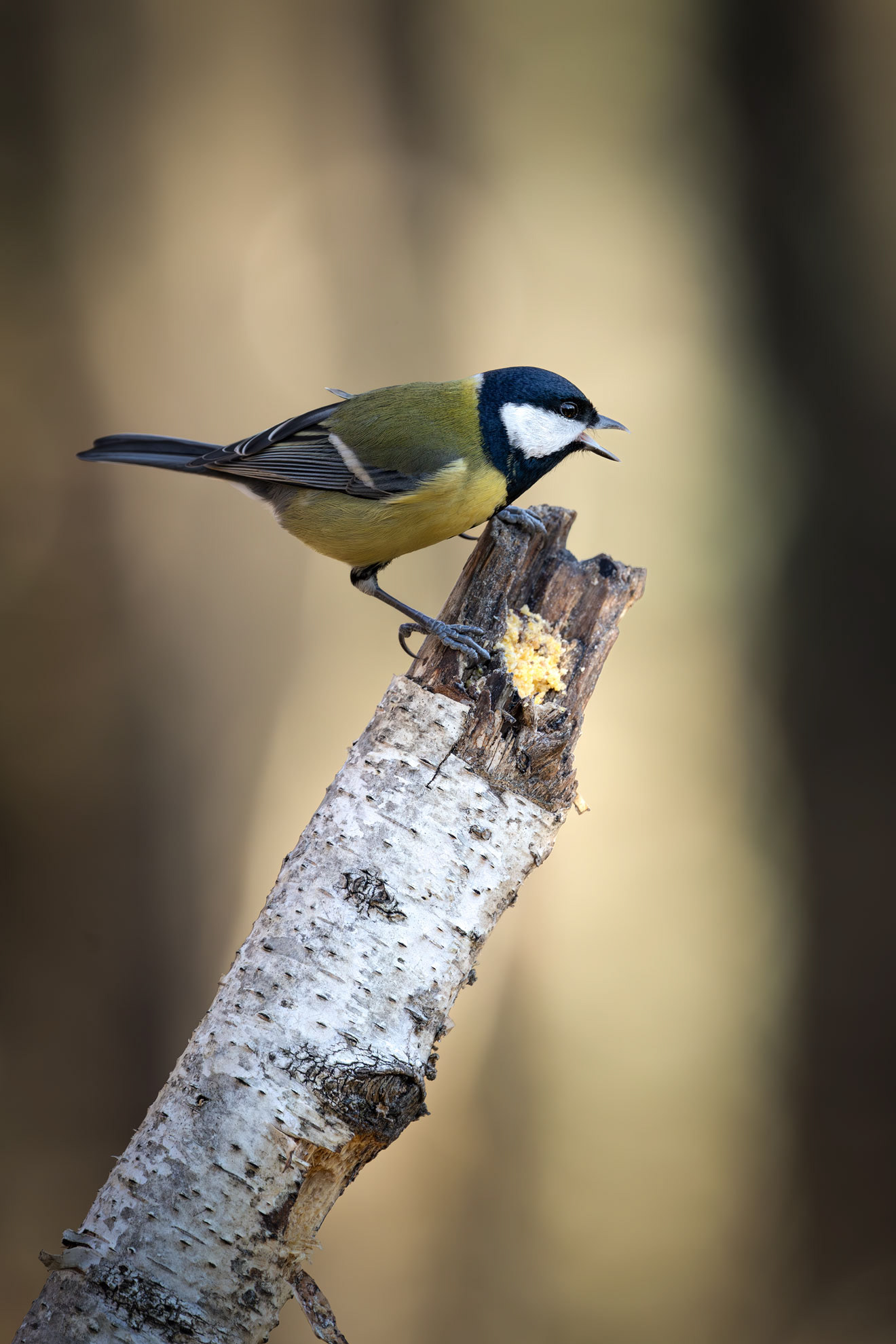 The Great Tit, the largest among its kind at 15 cm, is easily recognizable by its black head, white cheeks, and bright yellow belly marked by a bold black stripe. Highly adaptable, it thrives in woodlands and gardens, feeding on insects, seeds, and berries. Males with broader black stripes are often more attractive to females.