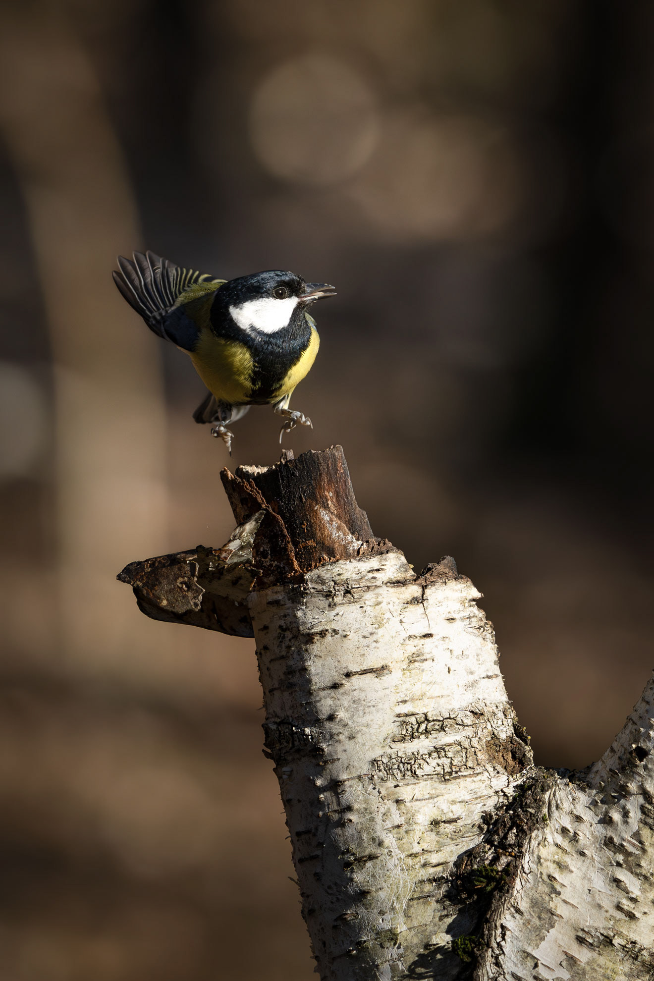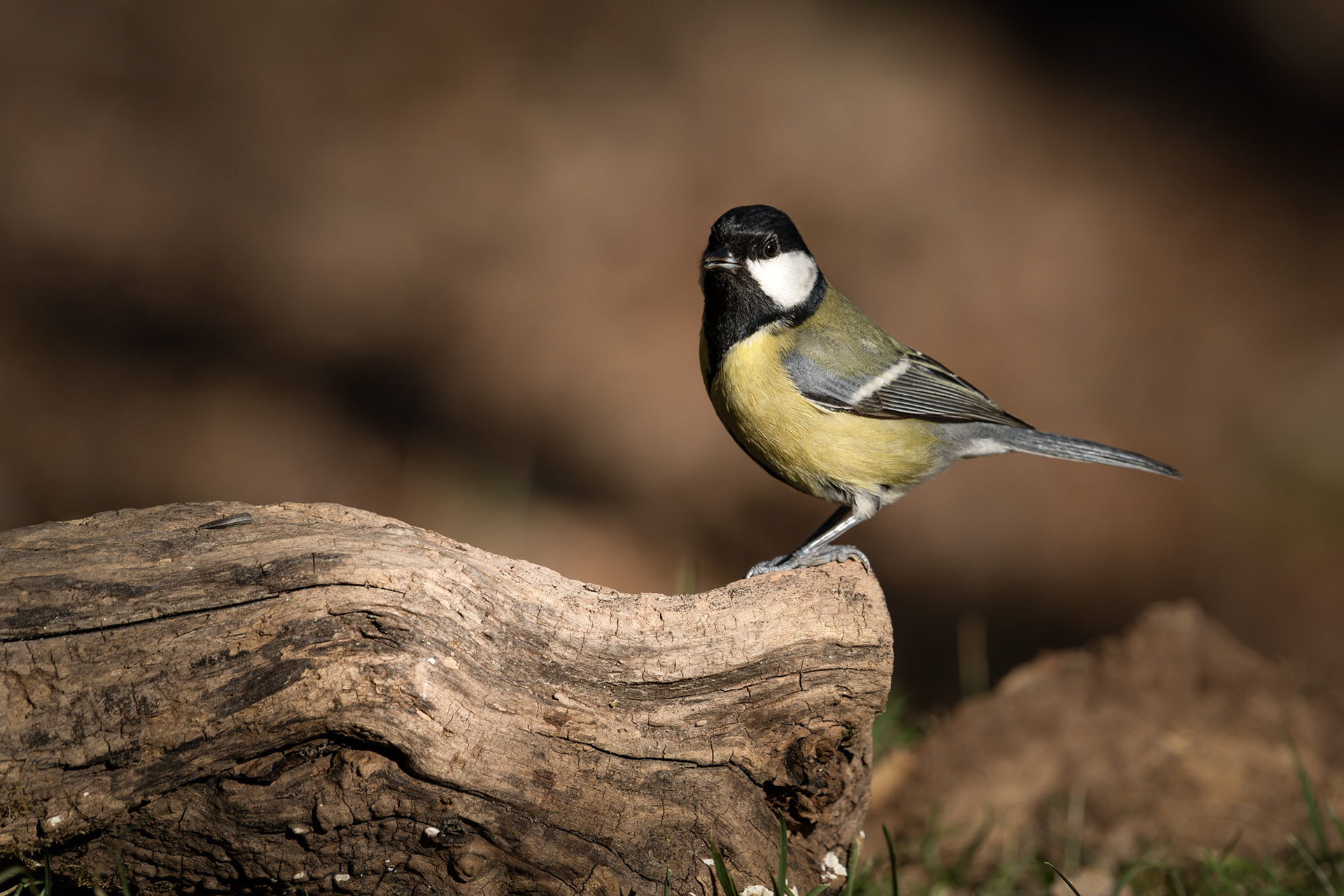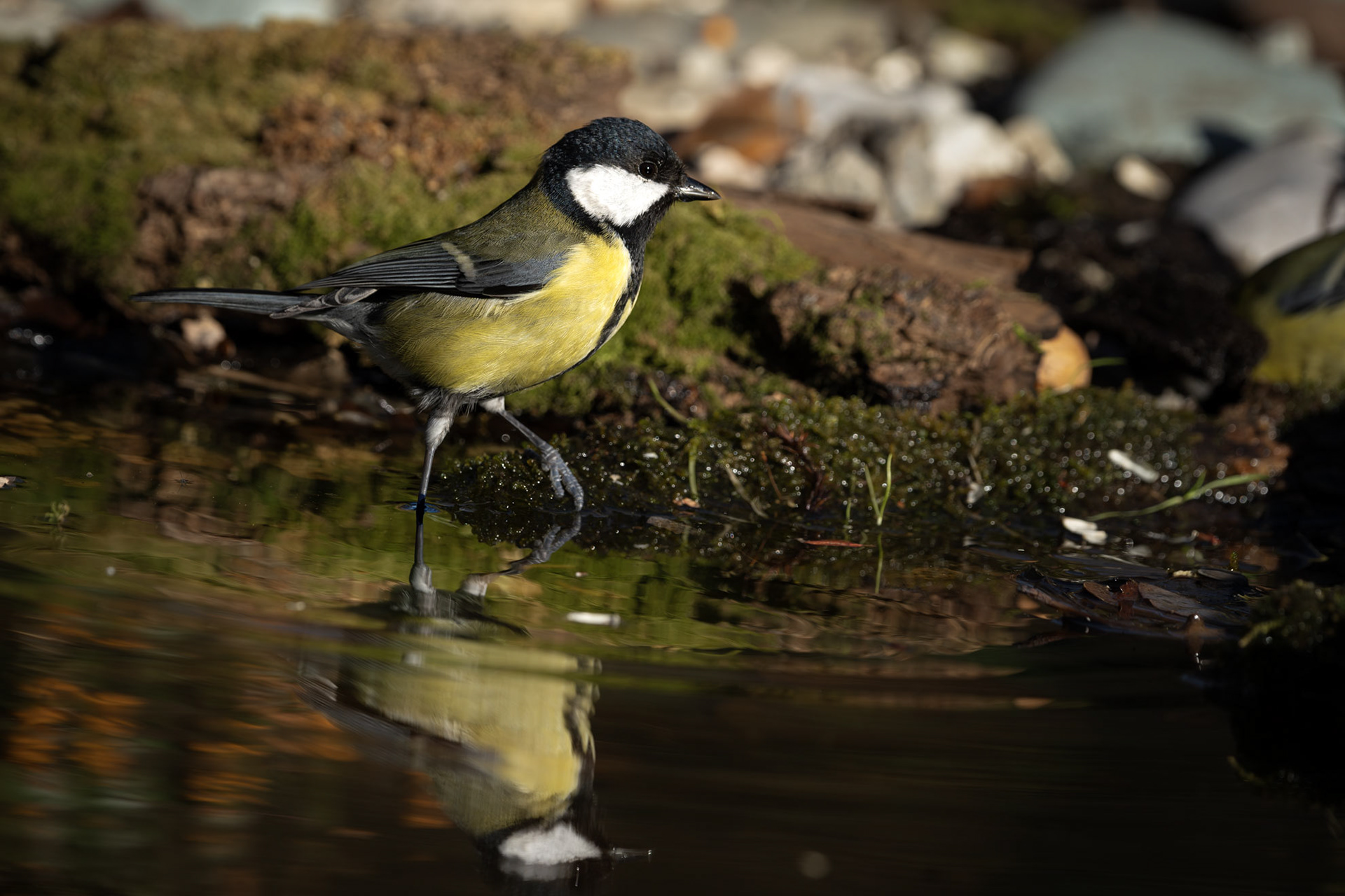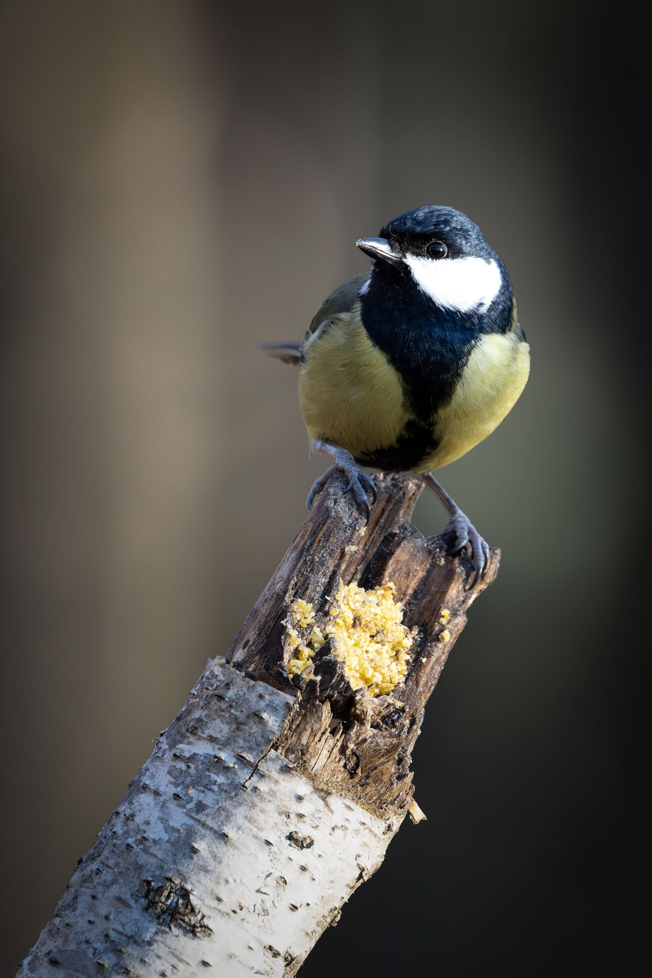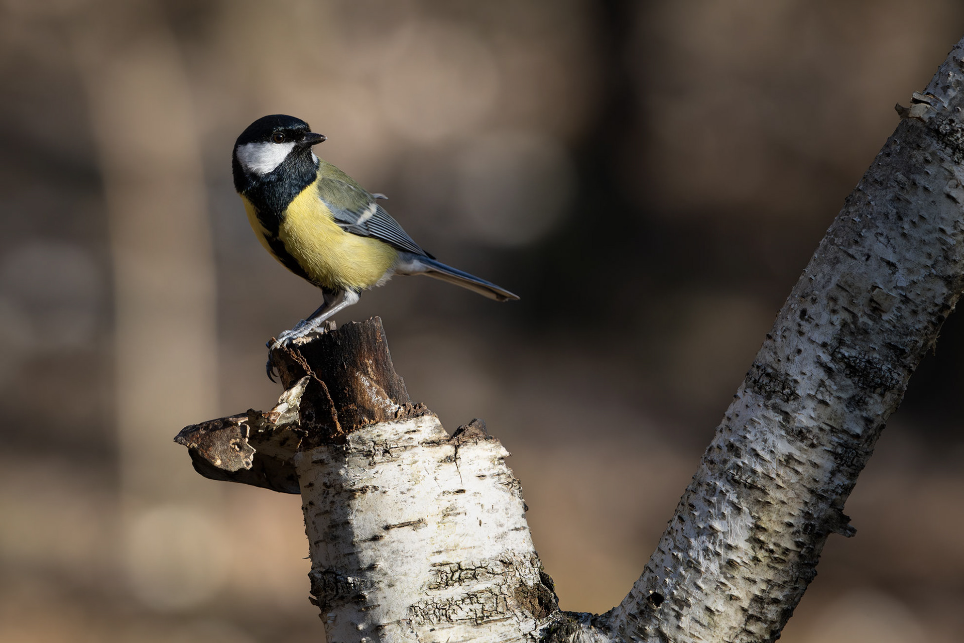 The Great Tit, the largest among its kind at 15 cm, is easily recognizable by its black head, white cheeks, and bright yellow belly marked by a bold black stripe. Highly adaptable, it thrives in woodlands and gardens, feeding on insects, seeds, and berries. Males with broader black stripes are often more attractive to females.