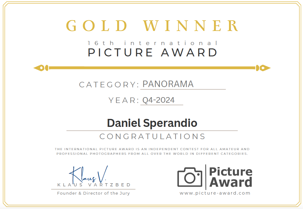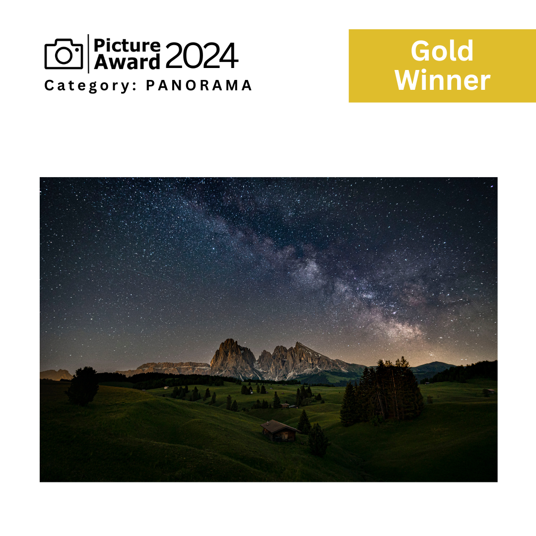 This photograph, awarded in the 16th International Picture Award (category Panorama), captures the profound silence and timeless beauty of a summer night in the Dolomites. Taken from the picturesque Alpe di Siusi, the image features the iconic Sassolungo and Sassopiatto under a canopy of stars. The scene embodies the stillness and anticipation of the moment, where nature's grandeur is illuminated only by the starlight.